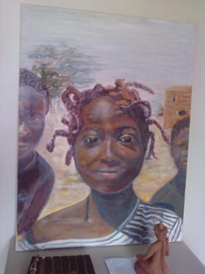 Ce tableau a été peint en 2012 et terminé en public lors de la Fête des bords de Vire en juin. Je me suis inspirée d'une photo rapportée du Burkina par mes amis Eric et Cath