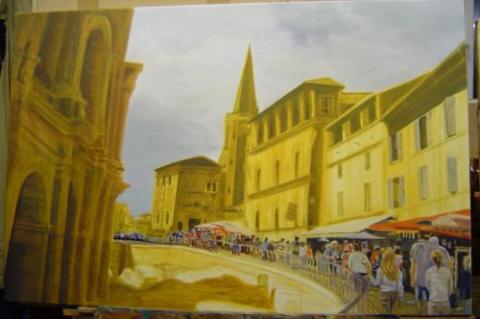 Une bonne quarantaine d'heures de travail, j'avais comme modèle une photo prise pendant mes vacances dans la Drôme. Nous  nous étions promenés ( mon frère mes nièces et ma fille au premier plan) dans les rues d'Arles en allant aux Saintes-Marie de la Mer. Souvenirs souvenirs....